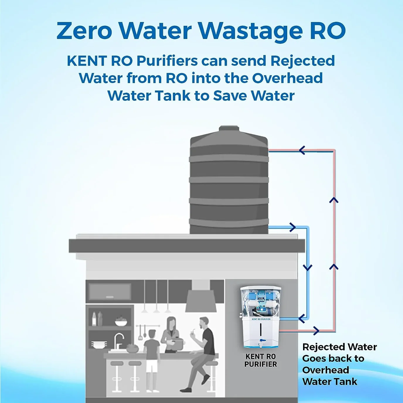 Zero Water Wastage Technology: Equipped with Zero Water Wastage Technology, it recirculates the rejected water to the overhead tank using its own pump, leading to absolutely no wastage of water during the purification process.